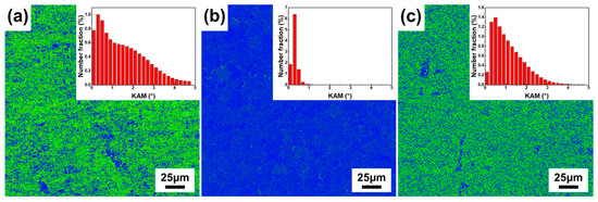 Kernel average misorientation maps of the samples subjected to (a) SA-CD, (b) HD-SA, and (c) DET-WD processes.