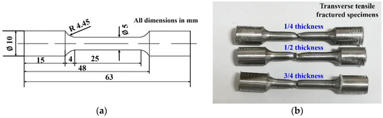 Figure 1. (a) Schematic of tensile specimen of steel plate. (b) Tensile fracture specimens.