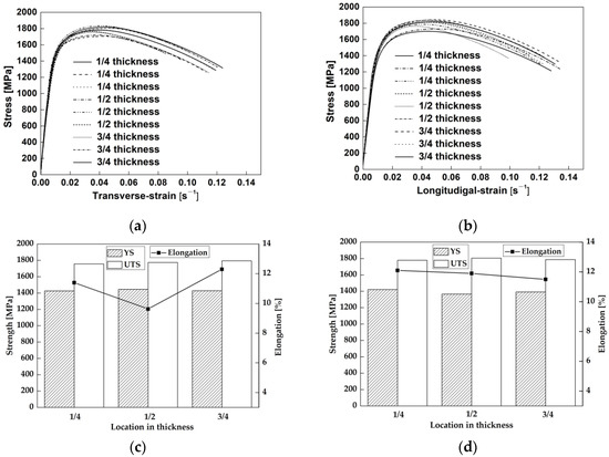 Figure 2. Tensile properties of steel plate: (a) Engineering strain–stress curves along the transverse direction, (b) engineering strain–stress curves along the longitudinal direction, (c) YS and UTS on the transverse direction, and (d) YS and UTS on the longitudinal direction.