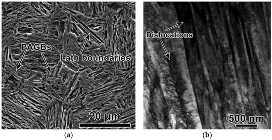 Figure 3a shows that the SEM microstructure of the as-received NM550 steel plate quenched at 880 °C and tempered at 180 °C, indicating a fully martensitic microstructure with the prior austenite grain boundaries (PAGBs) and lath boundaries clearly shown in Figure 3a. Some carbides can be observed in the martensitic lath with a relatively high density of dislocations, as shown in Figure 3b. The high strength of the investigated steel plate was attributed to the solid solution strengthening, precipitation strengthening, grain boundary strengthening, and dislocation strengthening of the fine martensitic matrix [2,18].