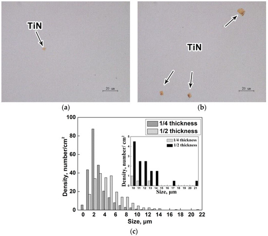 Figure 4. Optical microscopy images and size distribution of the TiN inclusions. (a) 1/4 thickness, (b) 1/2 thickness, and (c) size distribution of the TiN.