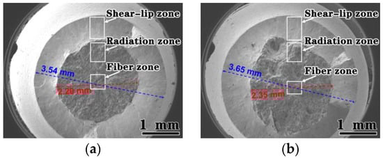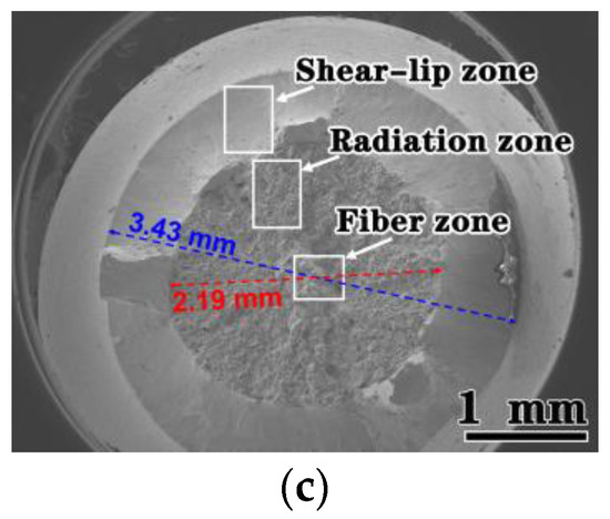 SEM was used to observe the tensile fracture surfaces at different thickness positions in the longitudinal direction, specifically 1/4, 1/2, and 3/4 of the plate thickness. Figure 5 shows the top view of the fracture surface of the tensile specimen, exhibiting the ductile cup. The fracture surface comprised fiber zone at the central region, radiation zone, and the shear-lip zone at the outer periphery, and the fracture sources were located in the center of the fracture fiber zones. The fracture surface sizes of 1/4 thickness and 3/4 thickness samples were essentially the same, which is smaller than that of 1/2 thickness sample, indicating more significant necking than that of 1/2 thickness sample.