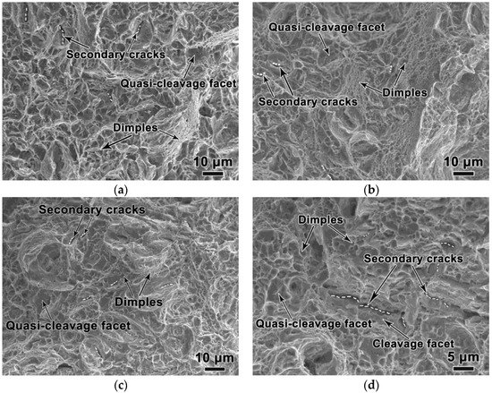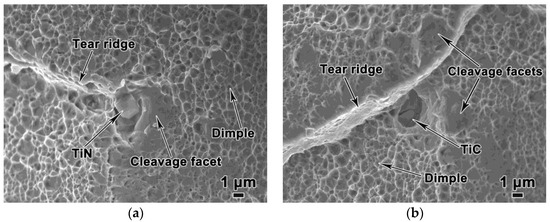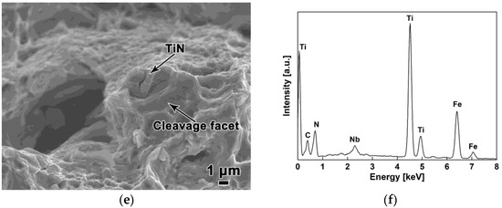 Figure 6 shows SEM images of the fiber zone in the longitudinal tensile samples, which included both fine and large dimples, cleavage and quasi-cleavage surfaces, and numerous secondary cracks at the fracture surface [20]. The amount of transgranular cleavage facets was higher in the 1/2 thickness samples than that of 1/4 and 3/4 thickness samples at the fracture surface, due to the higher density of TiN inclusions in 1/2 thickness samples. The secondary cracks, about 20 μm in length, were distributed on the adjacent cleavage surfaces, which turns in the junction of the cleavage surfaces. The secondary cracks can release part of the stress during the fracture process. As shown in Figure 6e, a regular-shaped TiN inclusion appeared on the cleavage plane, revealed by EDS analysis (Figure 6f). Two obvious deep cracks were present on the TiN inclusion, which indicates that the micron-scale TiN inclusions were broken and then separated from the matrix, leading to cleavage fracture. As previously reported [8,9], micron-sized (Ti, Nb)N/TiN particles can cause cleavage fracture, resulting in toughness decrease.