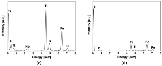 Figure 7. Secondary electron images of SEM of the shear lip zone in the longitudinal tensile samples: (a,b) TiN and TiC near the tear ridge in the 1/2 thickness samples, (c) EDS of TiN inclusion in (a), and (d) EDS of TiC inclusion in (b).