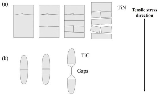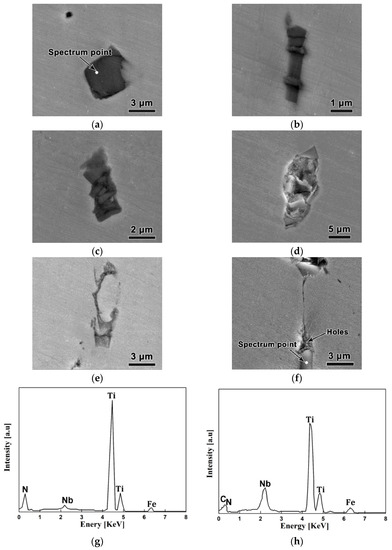 The fractured specimen was cut along the axial direction, and the broken morphology of inclusions at different distances from the fracture surface was observed by SEM. Figure 8 shows the SEM images of the inclusions at these different distances, which represent the fracture morphology of TiN inclusions under different load states. The closer to the fracture surface, the greater the load, and the more serious the TiN brittle fracture. Figure 8a shows the TiN inclusion far away from the tensile fracture, according to the EDS spectra shown in Figure 8g, on which prominent microcracks are present, and Figure 8b presents the TiN inclusion slightly away from the tensile fracture, on which multiple widened cracks are present. Figure 8c,d show TiN inclusions near the fracture surface. In Figure 8c, the TiN inclusion has been completely broken; in Figure 8d, the broken TiN fragments are rotated with the load direction, and large holes have formed in the middle of the TiN. This indicates that the TiN inclusions closer to the fracture surface were broken more severely. The breakage process of TiN inclusions under loading occurs in the three following successive steps, as depicted in Figure 9a: (1) Microcracks are initiated at the TiN inclusion and immediately reach the TiN/matrix interface but do not propagate into the matrix; (2) multiple cracks are generated, some of which are widened inside the TiN; and (3) TiN inclusions are further separated at the fracture location and eventually form holes.