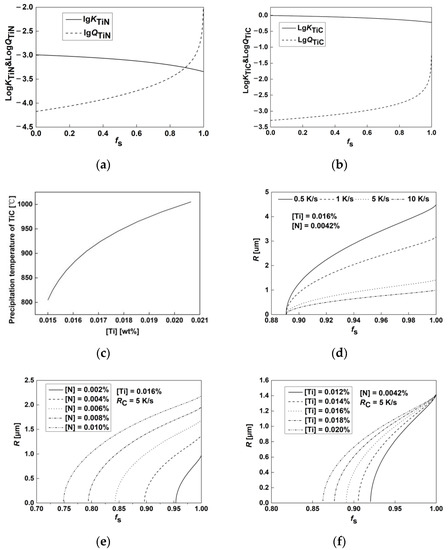 Figure 10. Thermodynamic analysis of TiN and TiC: (a) Relationship between kTiN and QTiN of TiN inclusion and fs, (b) relationship between kTiC and QTiC of TiC inclusion and fs, (c) relationship between TiC precipitation temperature and Ti content, (d) variation of the TiN radius (R) with RC, (e) variation of R with N content, and (f) variation of R with Ti content.