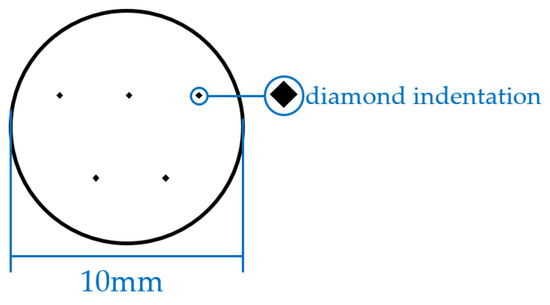 To reduce the experimental error, five points of tests were carried out in different areas of each sample. The selected areas in the experiment presented a W-type distribution. Figure 1 shows the distribution of test points. We selected areas under a microscope with a magnification of 200× and used the two diagonals of the diamond indentation to calculate the microhardness. The highest and lowest values in each group of data were omitted and the average of the remaining three microhardness values was taken as the microhardness value of the alloy.