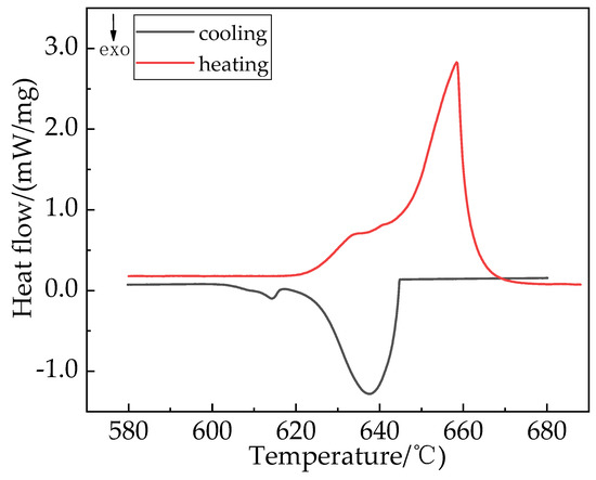 Differential scanning calorimetry (DSC) analysis was conducted with a NETZSCH 404C instrument to determine the UHTT parameters. For DSC analysis, a plate weighing approximately 15 mg from the as-cast ingot was heated to 680 °C under an Ar atmosphere with a heating rate of 10 °C/min. Then, the sample was cooled at the same rate of 10 °C/min under Ar protection. The obtained heating and cooling results are shown in Figure 5.