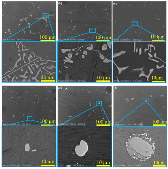 The microstructure evolution process of Al-5Zn-0.03In-1Er alloy at different UHTT temperatures is shown in Figure 6. Figure 6d–f are enlarged images of the blue box part of Figure 6a–c, respectively.