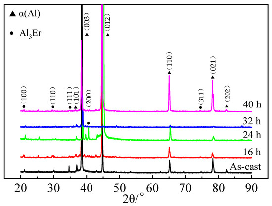 Combined with the microstructure evolution process in Figure 8, as can be seen from Figure 9, the diffraction peaks of α(Al) solid solution and Al3Er phases can be observed in all treated sample at 615 °C for different times. Each characteristic peak is calibrated with the Miller index. Compared with the XRD patterns of the as-cast alloy, there is no obvious difference in the α(Al) peaks in alloys after UHTT. After the alloy was treated at 615 °C for 16 h, most of the Al3Er peaks remained, because the supersaturated solid solution decomposed, and more Al3Er phases precipitated in the alloy. When the UHTT time exceeded 24 h, the content of Al3Er phases in the alloy began to decrease as the UHTT time increased and the precipitated phase dissolved back into the α(Al) matrix, because the solid solubility of Er in α(Al) matrix was not reached. After UHTT at 615 °C for 32 h, the Al3Er peaks nearly disappeared and the Al3Er phases were almost completely dissolved back into the α(Al) matrix or became Al3Er nanoparticles that were difficult to detect. When the UHTT time was 40 h, Al3Er peaks reappeared and Al3Er phases reprecipitated from the matrix, because the re-dissolution of supersaturated solution and the solutes in the matrix were depleted, which reduced the solid solubility of the Al3Er phases.
