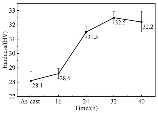 To further confirm the evolution of the second phase (Al3Er) during different treatment times, the microhardness tests were performed. The average microhardness of Al-5Zn-0.03In-1Er alloy under different heat treatment time is plotted in Figure 11. We added error bars to the line chart. Figure 11 shows that the microhardness first increased to the maximum when the treatment was 32 h and then hardly changed with increasing treatment time. When the UHTT time was 32 h, the microhardness increased by 15.5% more than that of the as-cast alloy.