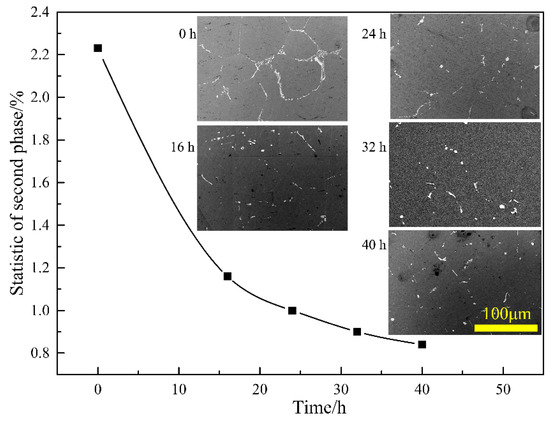 Figure 14 shows the evolution of the statistical amount of the interdendritic phase after treatment at 615 °C for different times. The statistics of every condition were analyzed by using Image-Pro Plus software and by selecting more than five images at a same magnification. The grain boundary phase first decreased sharply within the initial 16 h and its amount decreased slightly with the further prolonging of treatment time.