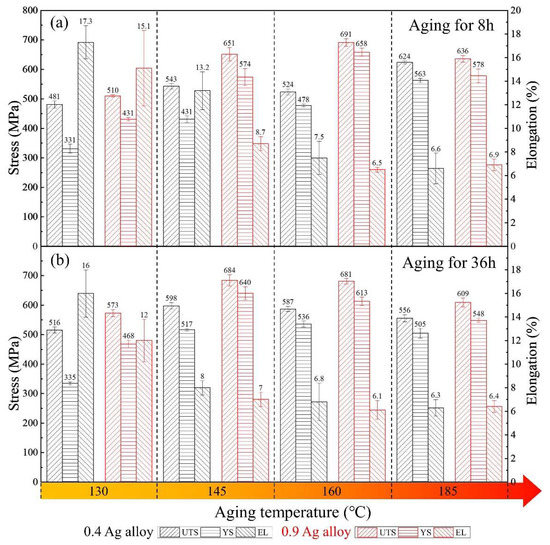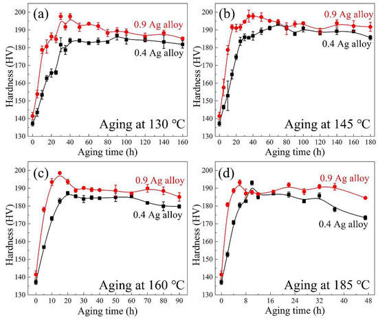 | Aging Condition | 0.4 Ag Alloy | 0.9 Ag Alloy | ||