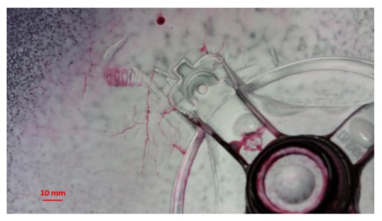 The adhesion of aluminum to the mold surfaces is manifested by the partial or complete adhesion of the cast material to the metal matrix. The cause is either the chemical interaction of the aluminum alloy and the metal matrix or the infiltration of aluminum into the surface of the matrix through cracks caused by cyclic thermal stress. Such cracking results from thermal fatigue, which reduces the strength of the mold material as the cycle of heating and cooling is continuously repeated. Fluctuations in thermal and mechanical stress initiate the growth of microcracks on the surface, followed by the gradual peeling of particles from the surface of the molds, which is documented in sources [5,6,7,8].