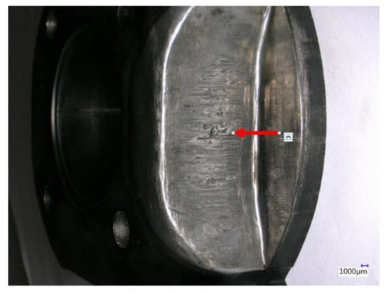 The service life of injection molds is negatively affected by a combination of tribodegradation factors. Cyclic loading by high pressures, in combination with the corrosive properties of liquid aluminum, leads to aluminization or oxidation of the mold surface. At the same time, thermal fatigue of the surfaces occurs, followed by their cracking (Figure 1). In the vicinity of the ejectors, the surfaces are also stressed by adhesive–erosive combined wear. High melt flow rates of aluminum alloys (up to 120 m/s−1), high pressures (up to 120 MPa), and high maximum surface temperatures of mold parts (up to 550 °C) lead to erosion, abrasion, corrosion, and thermal fatigue of the mold. This issue is addressed in publications [1,2,3,4,5].