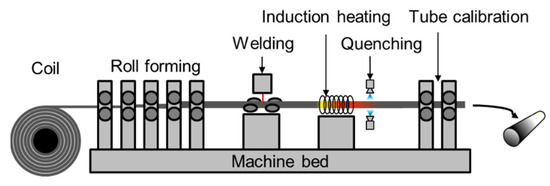 In the current literature, there are only a limited number of studies on the short solution annealing time for PWHT. Therefore, it is of great interest for inline heat treatment within seconds. One application for short-time solution annealing is roll forming and welding of a high strength AA7075 tube with subsequent induction heating and quenching, as illustrated in Figure 1. Roll forming is suitable for integrating further processes, such as welding, punching or milling into the process chain. Some investigations in the past also focused on in-line heat treatment to achieve tailored properties [13] or on heat treatment of the welding seam [14]. Solution annealing time is variable within the process and depends on the process speed but is still limited due to the endless length of the induction coil or continuous furnace. Fast heating is possible by inductive heating of the tube. Tailored mechanical properties of the tube can be achieved by targeted quenching of the tube. Targeted quenching of the welding seam is also possible within the process chain.