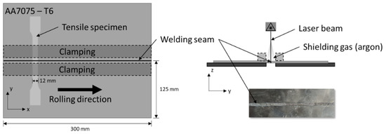 The length of the welding seam is 300 mm and the specimens are prepared by milling to achieve a zero gap for the welding process. Immediately before welding, the specimens are cleaned with acetone. Figure 2 illustrates the experimental setup for laser welding. The orientation of the tensile specimen is 90° to the rolling direction of the BM. Methods for evaluating the welds include a uniaxial tensile test with a Zwick Roell 100 kN material-testing machine (ZwickRoell GmbH & Co. KG, Ulm, Germany) with optical strain measurement. Vickers Hardness is measured with a KB30S-FA hardness tester (KB Prueftechnik GmbH, Hochdorf-Assenheim, Germany). A Leica Z16 APO and a Leica DM2700 (Leica Microsystems GmbH, Wetzlar, Germany) are used for microscopic examinations.