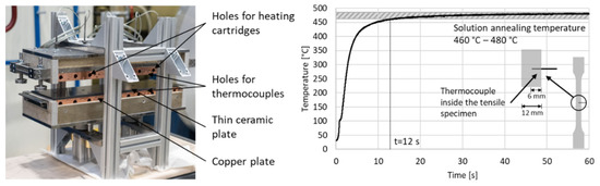 Figure 4 illustrates the heating device and a heating curve for the short-time solution annealing process. The solution annealing process was performed in a contact-heating device and aging in a Binder FDL 115 convection furnace (BINDER GmbH, Tuttlingen, Germany). During the solution annealing process, the temperature was measured by a thermocouple (type K), placed in a 6 mm deep hole inside the tensile specimen. The heat transfer to the tensile specimen is conductive, so the heating device heats the specimen to solution annealing temperature faster than a convection furnace with a heating rate of approx. 1.7 K/s [17]. The fast heating rate of approx. 36 K/s in the temperature range from 20 °C to 460 °C makes the process comparable to the process conditions of an inline heat treatment by induction heating. According to Zou et al. and [18], the solution annealing temperature of the AA7075 alloy is in the range of 460 °C–480 °C. After 12 s, the specimen is heated to 460 °C. The contact (copper) plates of the heating device have a temperature of 480 °C. According to the definition, the solution annealing time starts from the moment the sample has reached the temperature of 460 °C.