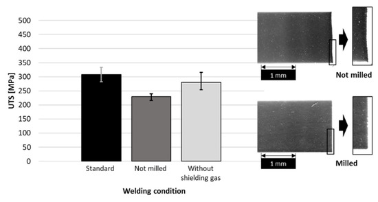 The first series of tests focused on the influence of the seam edge preparation and the shielding gas. Before welding, the plates were prepared in three conditions. The standard specimen was milled before welding and was welded with shielding gas. If the specimen is not milled before welding, the seam edge of the plate is not perfectly vertical to the top of the sheet and the welding gap is undefined. Oxide inclusions reduce the mechanical strength of the welding seam. The use of shielding gas prevents the penetration of the weld with oxide or hydrogen. Both lead to defects, such as hydrogen induced porosity or oxide inclusions in the welding seam. Figure 5 shows the influence of specimen preparation and shielding gas on the UTS of the welding seam. Error bars for the tensile tests refer to the minimum and maximum values of the UTS.