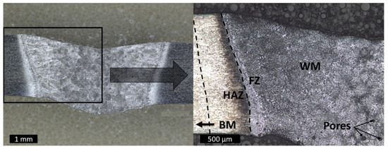 Figure 7 shows a characteristic welding seam for the standard welding condition. The weld metal (WM), fusion zone (FZ), heat-affected zone (HAZ) and the base material (BM) can be identified. An undercut of the welding seam can be detected. The presence of small pores could arise from hydrogen penetration due to the missing shielding gas cover on the bottom side. Nevertheless, the weld is suitable for subsequent investigations regarding the presence of pores, also according to DIN EN ISO 13919-2 [19]. Furthermore, the metallurgical phases relevant to the investigation of the influence of PWHT on the welding seam are not affected by the pores.