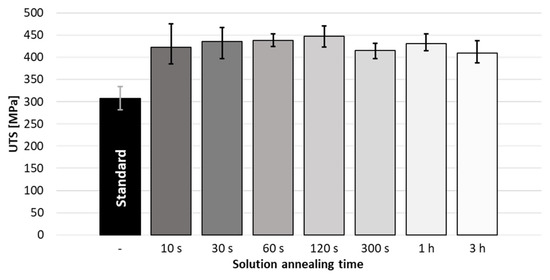 On the other hand, the short annealing times, that is, 10, 30, 60 and 120 s, are preferred in this study because there are no detailed studies on the WM and the FZ in the welded specimen in terms of structure and distribution of precipitations [22], which means that there is no recommended solution annealing time according to a standard. Figure 8 shows the influence of solution annealing time on the mechanical properties. The results show a significant positive effect of heat treatment in general, but only a small dependence of the mechanical properties of the welding seam on the solution annealing time. There is no advantage to annealing the samples longer than 120 s, when the maximum UTS of 448 MPa (joint efficiency of 76%) is achieved. The shorter solution annealing times lead to a remarkable increase in the UTS compared to the standard non-heat treated specimen, Figure 8. At a solution annealing time of 30 s, the UTS is 435 MPa, which corresponds to a joint efficiency of 74% and even at a 10 s solution annealing time, the joint efficiency is still 72%.
