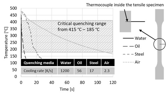 After the solution annealing time, the influence of the cooling rate on the welding seam was investigated. According to Liu et al. [23], the cooling rate in the temperature range of 415 °C to 185 °C should be at least 300 K/s to avoid unintended precipitations during the quenching process of Al-Mg-Zn-Cu alloys. Figure 9 shows cooling curves for different quenching media and cooling rates for the various quenching processes at the critical quenching temperature of 415 °C to 185 °C. The temperature of tensile test samples was measured by thermocouples (type K), placed inside the tensile specimens. Apparently, water quenching has the highest cooling rate, followed by oil and steel quenching, while air quenching has the lowest cooling rate. During steel quenching, the specimen was placed on a steel plate at a temperature of 25 °C.