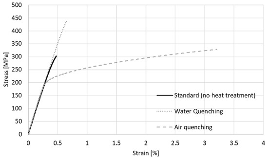 After comparing the UTS values of PWHT samples in various conditions, the stress-strain diagram of standard, water and air-quenched specimens are compared in Figure 11. The water-quenched sample has the highest mechanical strength compared to the other samples. The air-quenched specimen, on the other hand, shows plastic elongation above 3%. For subsequent processes, such as rotatory swaging or tube drawing, the formability of the material is required. After quasi-static tensile tests, the fracture of the standard specimens occurs in the weakest welded zone (Figure 12a). The same behavior is also observed in the welded zone of air-quenched and water-quenched samples after subsequent heat treatment (Figure 12b,c), which means that PWHT has no significant effect on the fracture location.