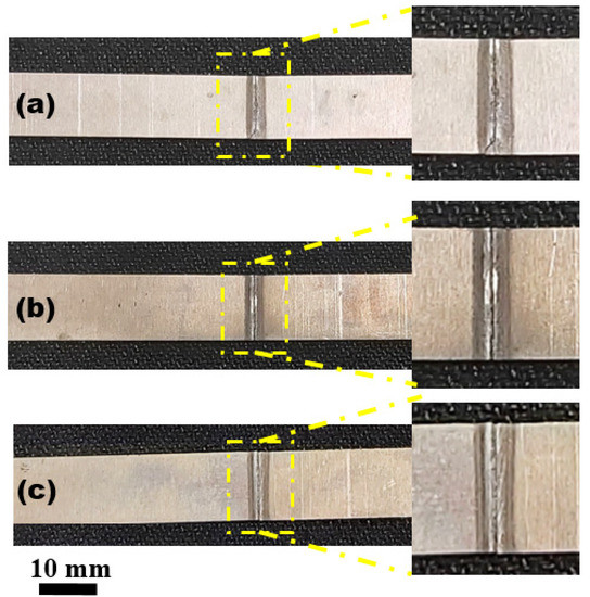 Representative AA7075-T6 welded samples after tensile test: (a) standard sample without heat treatment; (b) water-quenched; (c) air-quenched.