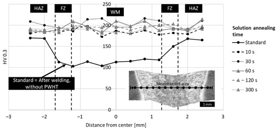Moreover, subsequent heat treatment with different annealing times enhanced the hardness values. Almost all water-quenched specimens exhibited a similar hardness profile throughout the welding seam. The 10 s solution-annealed specimen has the lowest hardness values of about 185 HV. On the other hand, longer solution annealing times lead to higher hardness values, corresponding to the tensile test results in Figure 8. With a solution annealing time of 30 s, the hardness increases slightly to values of about 220 HV. A further increase of the solution annealing time does not lead to significant changes of the hardness curves. In summary, it can be said that with higher solution annealing times, the influence of time becomes smaller.