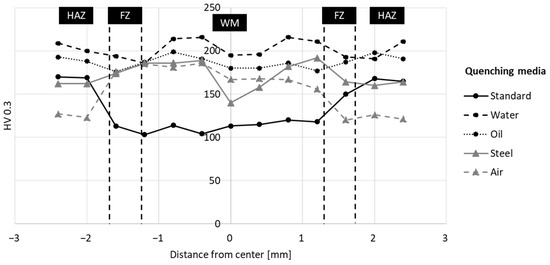 Figure 14 reveals the influence of the cooling rate on the hardness profile. The hardness of the oil-quenched specimen, similar to that of the water-quenched specimen, varies across the cross-section of the weld. The minimum hardness level in the middle of the WM of the oil-quenched specimen, about 185 HV, is lower than that of the water-quenched sample, 200 HV. The reason for this could be related to the microstructure, which will be discussed in the following section. Although the maximum hardness of 190 HV is about 1 mm from the center of the WM, a sharp decrease of 100 HV, is observed in the middle of the WM of the steel-quenched specimen. When approaching the HAZ, the hardness drops to a level of 160 HV. The hardness drop agrees well with the tensile test results, as the steel-quenched specimen has the lowest UTS according to the tensile test results (Figure 10). The hardness curve of the air-quenched specimen is inverse to that of the non-heat treated specimen, with the lowest hardness observed around 120 HV. Due to the relatively slow cooling rate, it is assumed that a coarse grain structure could be formed in the HAZ, resulting in a reduction of the hardness. On the contrary, the hardness of the WM is similar to that of the other heat treated specimens.