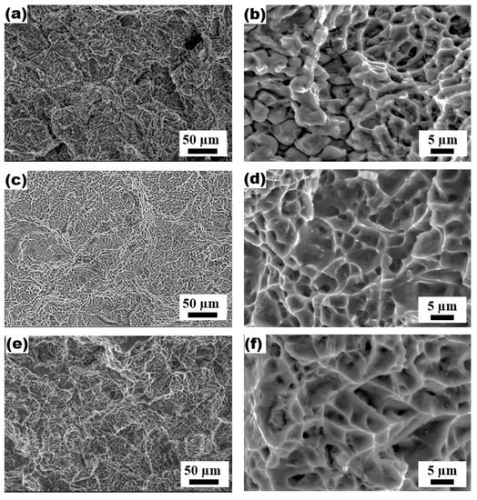 The fracture surfaces are observed after the tensile test to compare the effects of various conditions on the ductility of laser-welded joints. Figure 15 shows the fractured surfaces of the standard (no heat treatment), air-quenched, and water-quenched specimen. SEM images reveal that the fracture surfaces are covered with dimples, indicating that the dominant fracture mechanism for welded-specimen is microvoid coalescence [24,25,26]. The microvoids start to initiate at the interface of the matrix. With increasing load, the growing and changing of the voids leads to coalescence of the voids and subsequently to the final fracture.