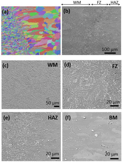 (a) EBSD, and (b) SEM images of weld zone of the standard sample, and enlarge SEM images of (c) WM, (d) FZ, (e) HAZ, and (f) BM regions.