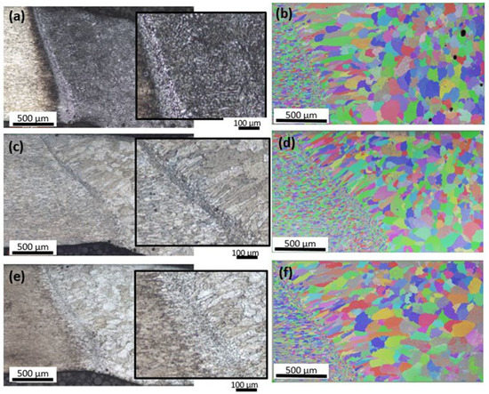 Optical microscope and EBSD images of (a,b) standard sample, (c,d) water-quenched, and (e,f) air-quenched samples.