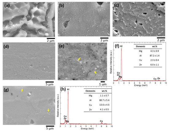 In addition, the structure and chemical composition of precipitations in the BM of water-quenched and air-quenched samples are also given in Figure 18. The relatively high number of fine precipitates including Al, Zn, and Mg elements is observed at the grain boundaries of the air-quenched sample indicated with yellow arrows in Figure 18d,e. It is assumed that these precipitates could be MgZn2 phases, as shown by the elemental analysis given in Figure 18f. Bayazid et al. [10] found the MgZn2 phase as precipitates at the grain boundaries of welded AA7075 alloy after aging. Moreover, Zhang et al. [24] found that the precipitates in the BM of the welded sample are mainly ƞ’ (Mg-Zn) phase, which is related to the main hardening phase in the 7XXX aluminum alloy. On the other hand, random precipitated particles were detected in the BM of the water-quenched sample either at the grain boundaries or in the grain, Figure 18g. The evidence of Mg-Al-Cu precipitates can be seen from the EDS results in Figure 18h. Bayazid et al. also found metastable MgAlCu phase precipitating on the welded areas of a cyclic solution-treated AA7075 alloy after aging for 24 h [10]. Therefore, the reason for the higher UTS and hardness of the water-quenched samples (Figure 10 and Figure 14) could be the formation of fine MgAlCu precipitates in the microstructure. It is known that detailed characterization is required to determine the type and morphology of the precipitates in the microstructure, which will be in the scope of future studies. Therefore, it can be concluded that the cooling rate after the PWHT process can influence the formation of precipitates in the microstructure of the welded AA7075 alloy.