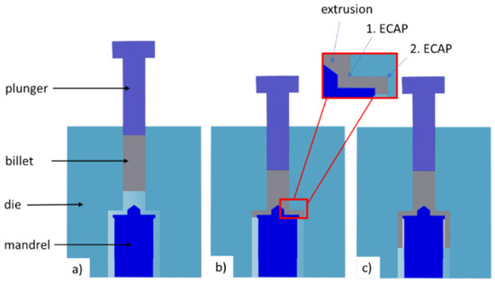 Schematic illustration of individual stages in the CSET process. (a) start of CSET; (b) situation after extrusion and 2nd ECAP pass; (c) final stage of CSET.