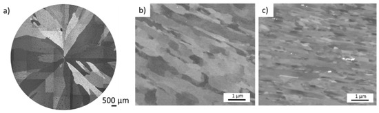 The microstructural details of both CSET processed samples were studied at the center of the tube wall on three perpendicular planes (see Figure 2). The grains in the initial unprocessed bar were of millimeters length and of the width of few tenths of millimeters (Figure 3a). Figure 3 presents the grain structure on the PD plane of the samples processed by CSET with stationary (b) and rotating (c) mandrel using SEM-BSE contrast. Both samples exhibit a refined grain structure compared to the initial bar. The grain structure in the sample processed with stationary mandrel (Figure 3b) is coarser than that of the sample prepared using mandrel rotation (Figure 3c). The grain structure in the SEM-BSE contrast is revealed by channeling contrast, which is sensitive to small changes in orientation, thus Figure 3b,c forebodes the subgrain structure present in the PD of both processed samples.