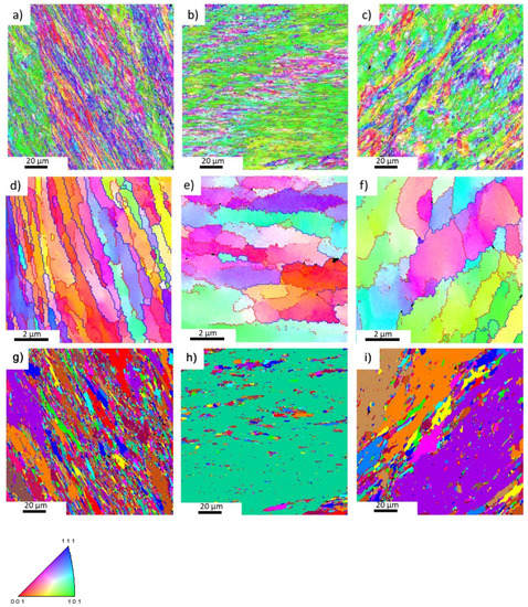 The bottom Figure 4g–i show the same OIMs as Figure 4a–c, respectively, but the regions with misorientation larger than 5° are colorized by unique colors without any relationship to changing crystallographic orientations. The presence of small grains inside larger ones reveals that recrystallization process started at some places but volume fraction of the recrystallized fraction is small.
