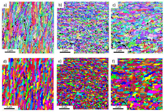 The OIMs reveal that original large grains were highly deformed and split into fine regions of similar crystallographic orientation. The percentage of high-angle grain boundaries (HAGBs) with misorientations above 15° was below 50%. This result is clearly confirmed in Figure 4d–f showing OIMs taken from a much smaller area, i.e., with a higher resolution. These figures show that low-angle boundaries (LAGBs; marked in red) are more frequent than HAGBs (marked in blue). The microstructure is mostly composed of elongated subgrains inclined parallel to the shear direction during ECAP with a length of tens of micrometers and a width of units of micrometers.