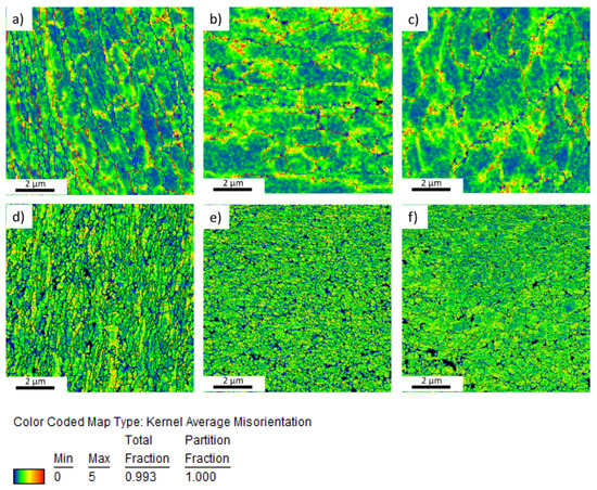 KAM maps in Figure 6a–c (corresponding to OIMs in Figure 4d–f, respectively) reveal high contrast variation in the sample processed with stationary mandrel. Relatively large blue areas correspond to places with very low lattice distortion, i.e., with low density of lattice dislocations. It can be supposed that these areas correspond to subgrain interiors. The blue areas are surrounded by yellow regions where the local strain is very high. These regions probably represent dislocation walls or subgrain boundaries with small misorientations. KAM maps in Figure 6d–f (corresponding to OIMs in Figure 5a–c, respectively) show a more homogeneous distribution of the local strain in the sample processed with rotating mandrel. This corresponds well to the dynamically recrystallized character of the microstructure where dislocations are distributed more homogeneously inside grain interiors and no dislocation walls or subgrain boundaries are formed. The GND density estimated as a mean value from the whole investigated areas was estimated to be 1 × 1012 m–2 in the sample processed with stationary mandrel, whereas approximately 1.5 × 1011 m–2 in the sample processed with rotating mandrel.