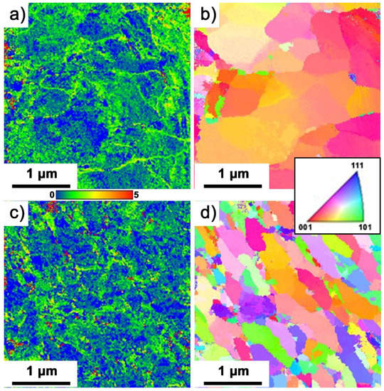 To obtain information on the local strain distribution inside grains of the final tubes, KAM maps were evaluated from EBSD measurements. KAM describes the average misorientation of a selected point relatively to all neighboring points. The distance between neighboring points was selected 50 nm in our measurement. The KAM threshold value was chosen to be 5° to exclude large misorientations due to subgrain boundaries or LAGBs with higher misorientations (5 to 15°). The correlation between the local lattice distortion and the color in KAM maps is given in Figure 6.
