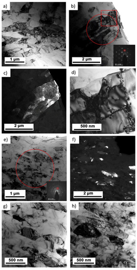 Figure 8 displays the real microstructures of both samples. Elongated subgrains with a length of about 1 µm were found in the sample processed with stationary mandrel (Figure 8a). The area denoted by a red circle in Figure 8b is shown as dark field image in Figure 8c formed by the selected diffracted beam on the inset in Figure 8b. It reveals that subgrains form grains with a size of several micrometers. The area denoted by a red square in Figure 8b was investigated at higher magnification (Figure 8d) and the presence of dislocations predominantly arranged into dislocation walls and subgrain boundaries was observed.