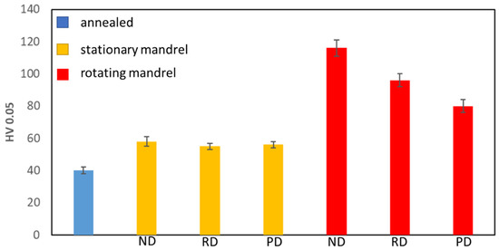 To study the differences in the mechanical behavior of the samples processed with stationary and rotating mandrel, microhardness measurements were carried out. Figure 9 presents the comparison of measured average values of microhardness on different planes. The average microhardness of the sample processed with stationary mandrel was of around 56 ± 4 HV0.05 for all measured planes, which is about 40% higher than the value of 40 ± 1 HV0.05 measured on the annealed sample. Much higher values of the microhardness were measured for the sample processed with rotating mandrel. The highest value, 120 ± 3 HV0.05, was detected on the ND plane of the processed tube, whereas 98 ± 3 HV0.05 and 85 ± 3 HV0.05 were measured on the RD and PD planes of the same sample, respectively. In all cases, the microhardness increase is higher than 100% in comparison with the initial material.