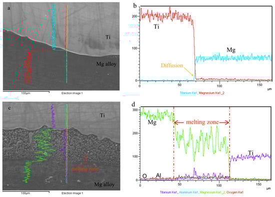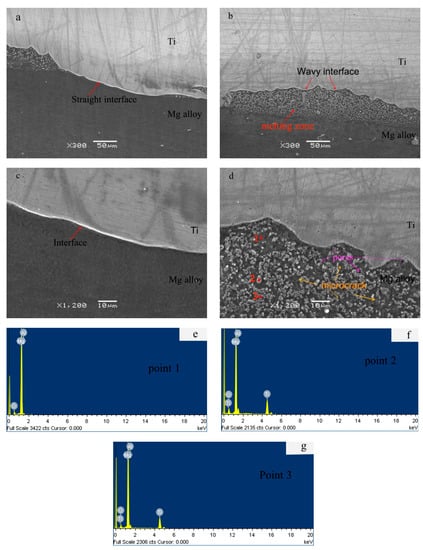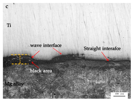 - The interface of the Ti/Mg alloy plate is made up of both straight areas and wavy areas. In straight areas, the element diffusion occurs across the interface. Additionally, in wavy areas, a melting zone occurs in the Mg alloy layer near to the interface. Lots of light particles embed on the melting zone. The compositions of these particles are Mg, Al, Ti and O elements. Based on the EDS analysis results, the possible phases of MgTi and Mg2Ti are formed in particles.