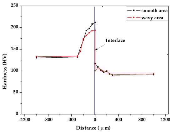 - Tensile test shows that the ultimate tensile strength of the clad plate is 377 MPa. Compared with the Ti sheet, the clad plate shows an 18% increase. The shearing strength values of the clad plate are about 68–87 MPa. The microhardness values of clad plate are higher than original sheets from the interface to 300 μm away. At over 300 μm, the hardness value decreases, and approaches that of the original sheets. Compared with the straight areas in the interface, the hardness value of the Mg alloy layer in the wavy areas close to the interface increases by 12%.