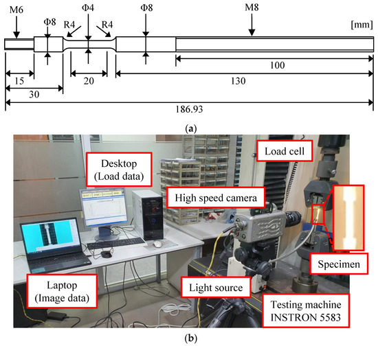 Uniaxial tensile tests were conducted for hardening behavior of the AISI 304 steel in the quasi-static state. Figure 1a shows the drawing of the test specimen of a round bar type dog-bone shape with dimensions, where the gauge length is 20 mm and the diameter of the gauge region is 4 mm. The specimen was also used in intermediate strain rate tests to have consistent results of the hardening curves. The gripping region in the specimen had threads to prevent slip during gripping in the tests. The testing machine was the INSTRON 5583 (Instron, Norwood, MA, USA), whose maximum load capacity was 150 kN and crosshead speed was from 0.05 mm/min to 500 mm/min. Target strain rates were from to in these experiments, and corresponding crosshead speeds were from 1.2 mm/min to 120 mm/min, respectively, for each target strain rate. A high speed camera, Phantom v5 (Phantom, Wayne, NJ, USA), was used to capture images of a speckle pattern during the deformation and Digital Image Correlation (DIC) method was utilized for strain analysis [24,25]. Frame rates were set to 1 fps, 10 fps, and 200 fps for each target strain rate, respectively. Figure 1b shows the experimental setup with the INSTRON 5583 in the quasi-static state case.