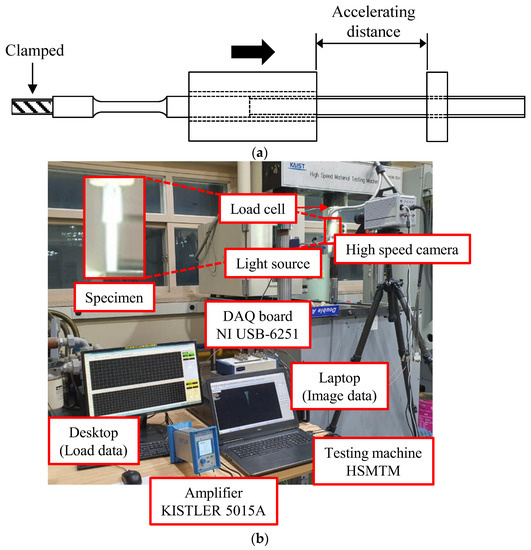 Uniaxial tensile tests were conducted for hardening behavior of the AISI 304 steel at intermediate strain rates with specimens of the same dimensions for the quasi-static state tests, as shown in Figure 1a, to avoid discrepancy in the results due to the difference of the specimen shape. The testing machine was a High Speed Material Testing Machine (HSMTM, KAIST, Daejeon, Korea). The equipment was a servo-hydraulic testing machine with a maximum load capacity of 30 kN and a crosshead speed of 0.003 m/s up to 7.8 m/s. In these tests, the accelerating distance was required so that the crosshead reached the target loading velocity, as described in Figure 2a. Target strain rates were , , and in these experiments and the crosshead speeds were 0.02 m/s, 0.2 m/s, and 2.0 m/s, respectively, for each target strain rate. During the test, deformed images were acquired with a high-speed camera of FASTCAM SA5 (Photron, Tokyo, Japan), because a higher frame rate was required to capture enough number of images of a speckle pattern during the deformation. Frame rates are set to 1000 fps, 10,000 fps, and 25,000 fps respectively for each target strain rate. DIC analysis was also used for strain analysis and Figure 2b shows the experimental setup with the HSMTM in the intermediate strain rate case.