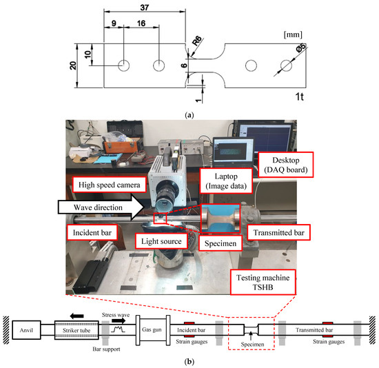 where , , and are the elastic modulus, the stress wave velocity, and the cross section area of the transmitted bar or incident bar respectively, and , are the longitudinal length and the cross section area of the specimen, respectively, and and are elastic strains measured at the transmitted bar and the reflected bar respectively. Figure 3a shows the drawing of the TSHB test specimen with the typical geometry [5]. The maximum pressure capacity of the TSHB was about 550 kPa. In the present experiment, a pressure of 138 kPa was applied to induce deformation at a strain rate of , which was enough for the specimen to fracture in the gauge section by the first stress wave. Figure 3b shows the experimental setup with the TSHB in the high strain rate case.