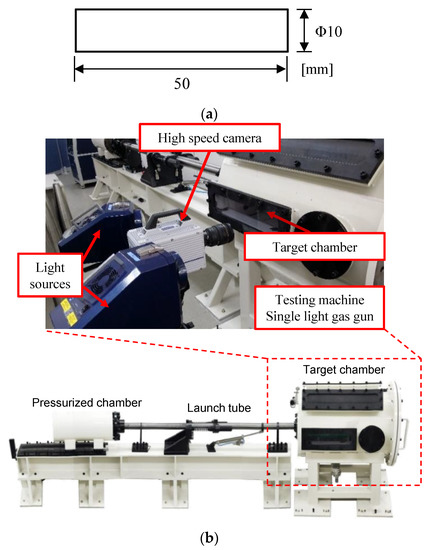 Taylor impact tests for deformation at ultra-high strain rates: (a) Drawing of a specimen; (b) Experimental setup with the Taylor impact testing machine. (Adapted from ref. [6]).