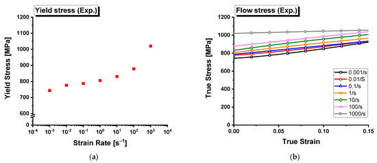 Experimental results at strain rates ranging from to : (a) Yield stress; (b) Flow stress curve.
