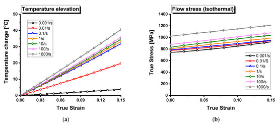where a conduction factor is the function of strain rate, is the ratio of the transformed heat to the plastic work, is the density, and is the heat capacity of a material. Figure 6a,b show temperature elevation during the deformation and the isothermal flow stress at each strain rate, respectively. The yield stress is not affected by the thermal softening effect because there is no temperature change during the elastic deformation, and the amount of strain hardening in the isothermal state becomes larger than that in the adiabatic state that corresponds to the experimental case in Figure 5b, especially at high strain rates.